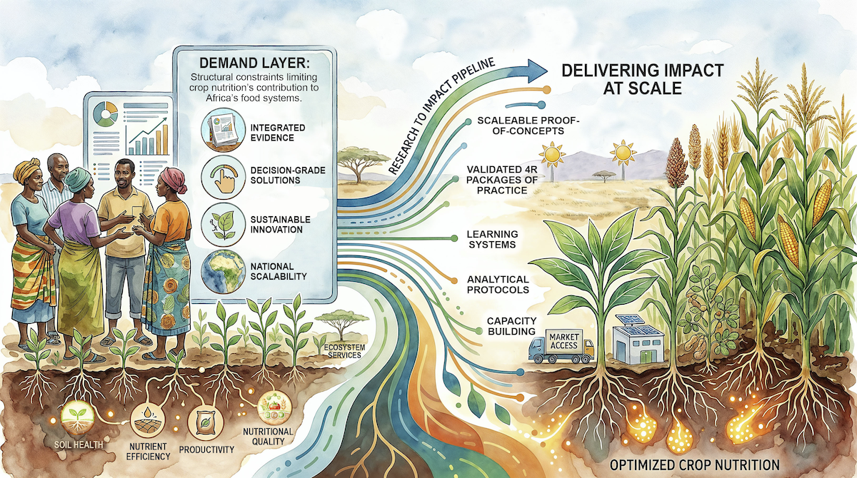 APNI2030 is structured around a clear progression from why research is needed to how it delivers impact at scale. The logic begins with a defined demand layer describing the structural constraints limiting the contribution of crop nutrition to Africa’s food systems. Our solution pathways provide the strategic structure within which research is generated, synthesized, and applied.